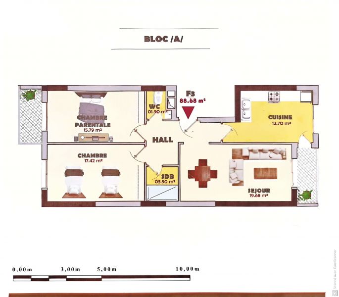 Antares 8 est une résidence qui contient des appartements de différentes superficies de types F3 et F4 simplex .